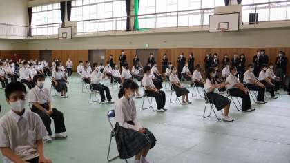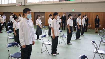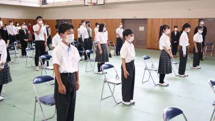 1枚目。保護者の方と写真奥に写っている教職員で盛大な拍手を送りました。2、3枚目は「開式の辞」を「気をつけ。」の姿勢で聞く新入生たちです。ピシッとしていました。