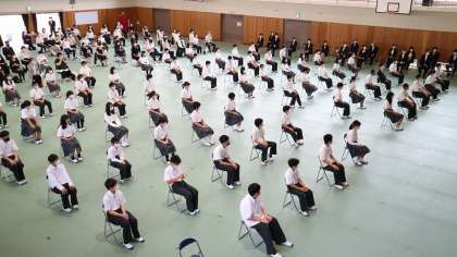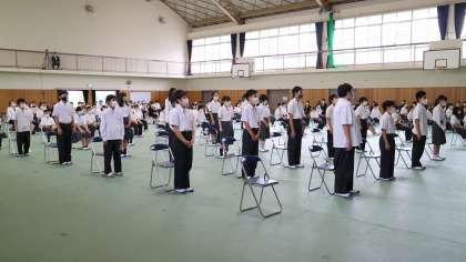 新入生が担任の先生から名前を呼ばれて返事をして、起立しているところです。