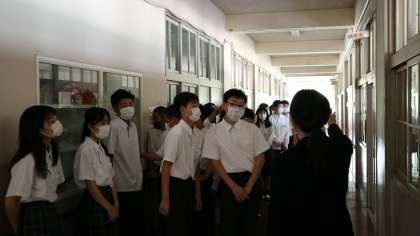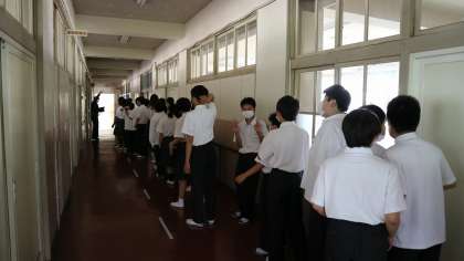これらの写真は、入学式を終えて4階の教室に行くまでに校舎内見学をしているところです、通常なら4月に終わっているところですが、今までの登校では決まった教室しか行くことはできませんでした。理科室とか調理室を初めて教えてもらいました。