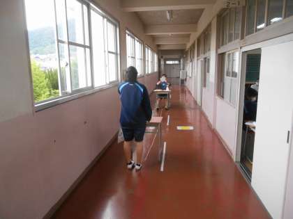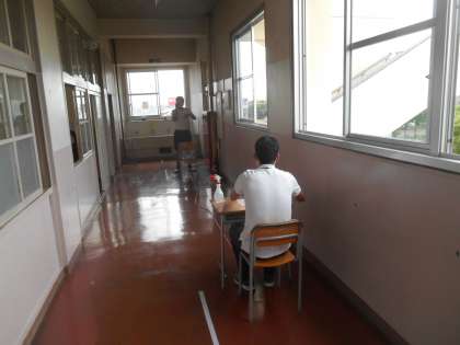 廊下で視力検査をしているところです。この他に聴力検査も行いました。