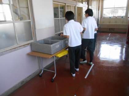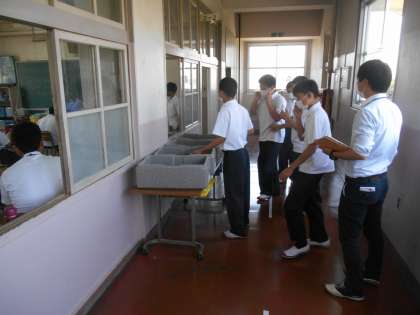 普通なら、配膳当番が各自の机まで運ぶのですが、コロナのことで一人ひとり取りに行くことにしました。