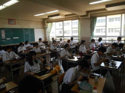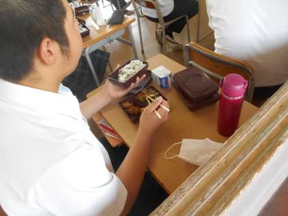 久しぶりの給食風景です。3枚目は、よく見てください。お代わりを二人前追加しています。頼もしい人です。