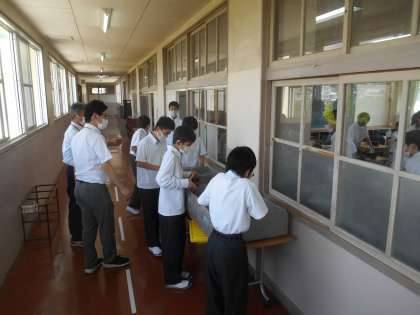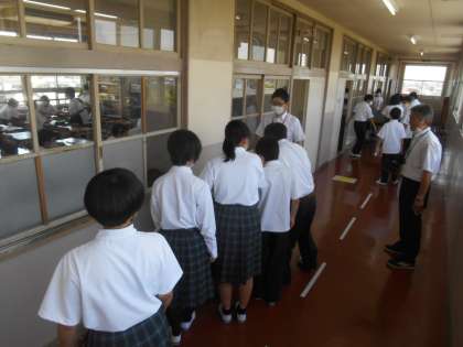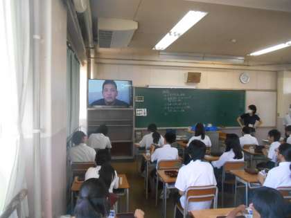 この写真も廊下で、自分のおかずを持っていっているところです。テレビに映っている顔はこのテレビを普通教室全部に設置した先生が、活用法について説明しているところです。
