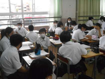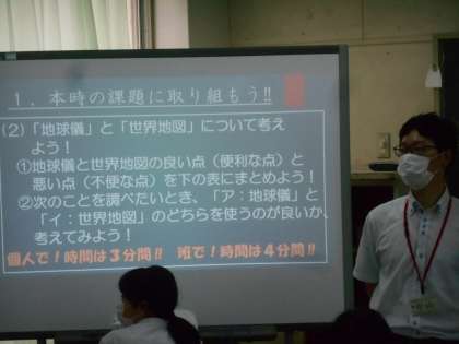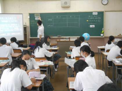 社会科教室です。先生の質問にペアで意見交流をしていました。