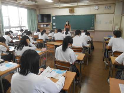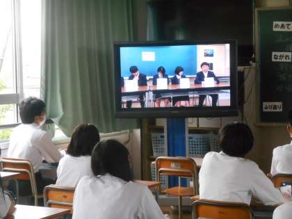 3年生ですね。さっそく進路学習で、高校等の見学(オープンスクール)のときの心構えなどを学んでいました。続いて、テレビで卒業生から中学3年生にメッセージが送られてきたので、それを集中して見ていました。とても参考になったようです。