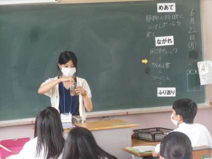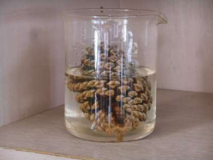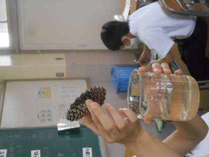 復習が終わると、先生が「これ、まつぼっくり。中学ではまつかさと呼んでくださいね。このまつかさを水に30分もつけると、開いているところが閉じます。」と言って、テレビ台の下に置きました。そして、授業終わりに見てみるとほんとに閉じていました。不思議です。これが受粉に関係あるそうです。