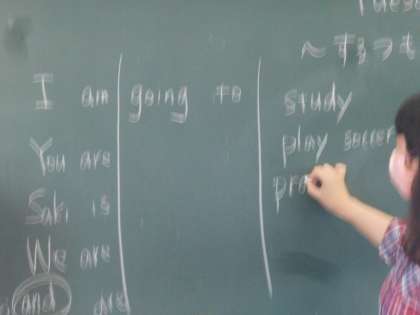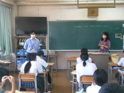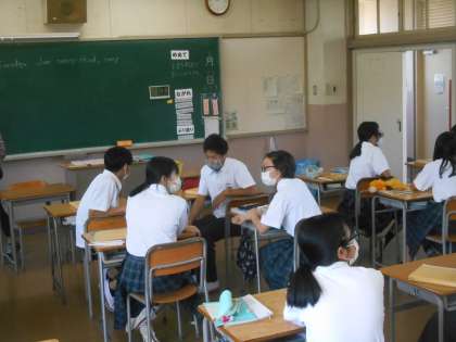7月3日(金)までの2週間、北条中では授業を交流し合い、授業力向上をめざします。3限の英語の授業を1時間見学しました。英語の先生が2人で英会話を行い、その意味をペアで確認しているところです。