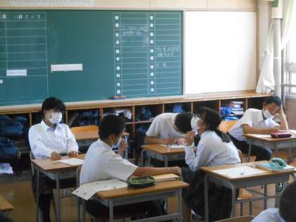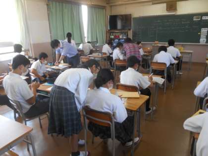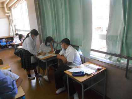 この授業での生徒たちの活動の積極さは特筆すべきものがあります。先生の発音に続いて、大きな声で(コロナで大きな声で言えませんが…)リピートします。何がうれしいかって、心が開放されています。安心して先生の問いに答えていきます。すばらしいです。「see」と「she」の違いも先生が使い分けるのを生徒がその違いが分かるように、精一杯発音していました。間違いなく賢くなっていくと思います。加えて、自分の課題を済ませると、分からない人の横にスッと立って、困っているようだったら、声をかけていました。ほんとにすばらしい。