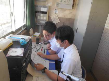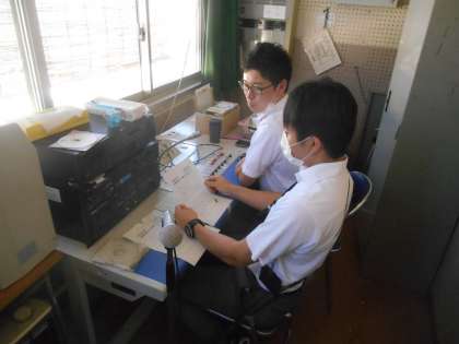 今日のテレビ放送はお休みで、先生たち二人でラジオ風放送を流しました。先生たちの楽しいおしゃべりと「366日」というJPOPが流れました。放送室では写真のような状態でした。