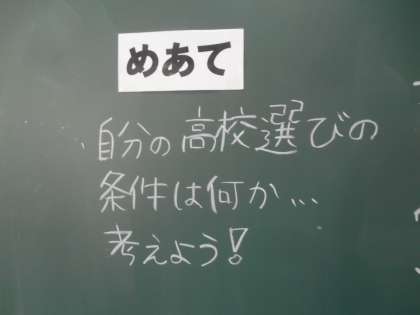 進路について考える時間でした。学力、通学時間、校風、クラブ、卒業後の進路その他、どんなことを考えて進路先を考えるか、意見交流していました。とても大事な時間でした。その中で、お家の人に苦労をかけたくないという意見もあって、胸が熱くなりました。すばらしい。