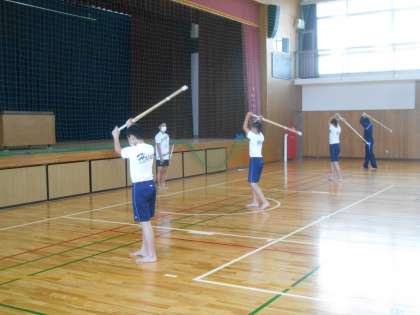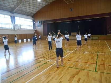 剣道が始まりました。まずは基本の素振りを繰り返します。何十回も素振りをしていくと、始めとは見違えるほどの違いが出てきました。すばらしい。剣道の授業が始まったばかりなので、剣道独特の気合「ヤッー!!」がなかなか言えません。そんな中、常に「ヤッー。」と言い続けていた○○さんの姿はかっこよかったです。