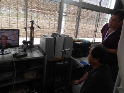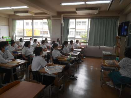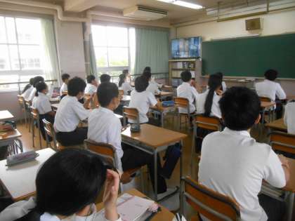 本来なら、非常ベルを慣らし、グラウンドに避難して、消防署の人からお話を聞くというパターンですが、今回はコロナの関係で全員集合できませんでした。校内放送(テレビ)を活用して、消防署作成のDVDを見て、火災時の避難の方法等について学習しました。放送室にいるのは、避難訓練と放送担当の先生たちです。