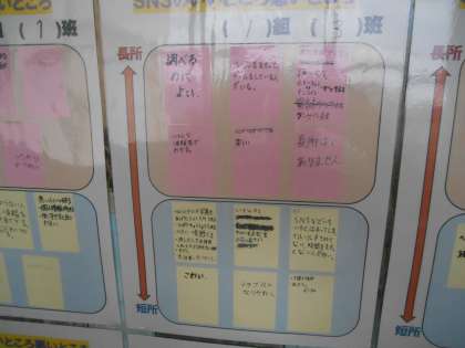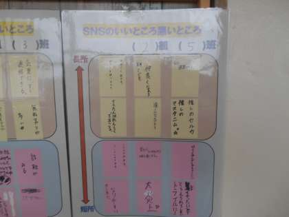 SNS上でのトラブルが大きな事件にもなっています。北条中も例外ではありません。大きな事件が起こる前にSNSの使い方について考える時間をもちました。便利なところと危険なところについて紙に書いて見ました。