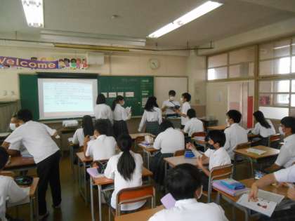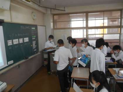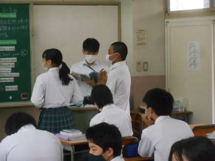 現在完了の英文を覚えて、ペアで先生のところに行って、聞いてもらっています。座っている人たちは、練習しています。