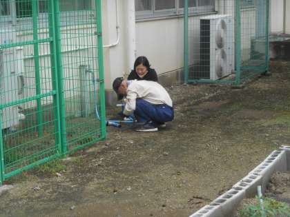 おおぞら学級から外に出るスロープのあたり(1枚目)が夜中からの大雨で大きな水たまりになっていました。写真はマンホールに大量の水を流したあとのすっきりした様子です。環境整美員さんとおおぞら学級担任が朝からずっと対応した結果です。ありがとうございます。