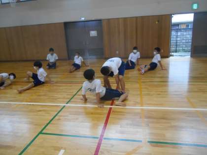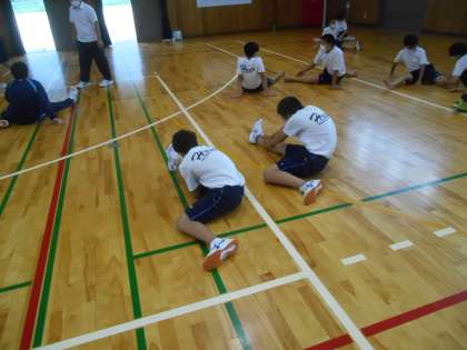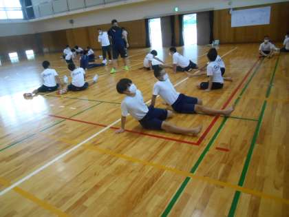 ハードル走をイメージして、足のストレッチをやっています。体の堅い人は、ヒーヒー言いながらがんばっていました。