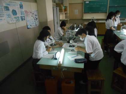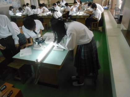 顕微鏡を使って、胞子を見ています。