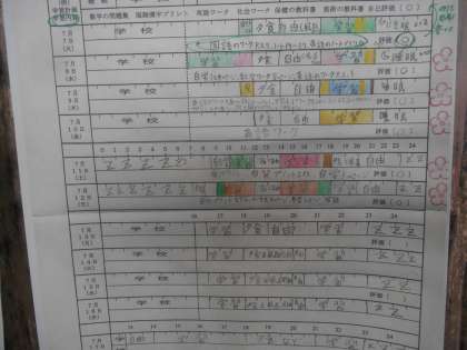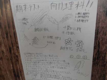1年生のテスト勉強計画がすばらしくて掲示されていました。よく見ると、学校から帰って夕食までに2時間ほど勉強しています。帰ってすぐに勉強して、夜遅くまでしない。しっかり寝て、授業を受ける。これがすばらしい。