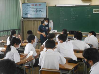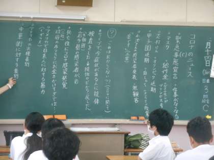 1年生では、新型コロナの三つの顔ということで、三つの観点からコロナについて振り返ってみました。病気だけでも苦しむ人が多いのに、そこから拡大して心を痛めることが起きているという現実について考えました。しっかり、意見が出ていたのには感心しました。