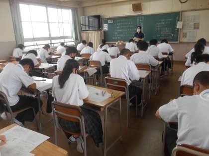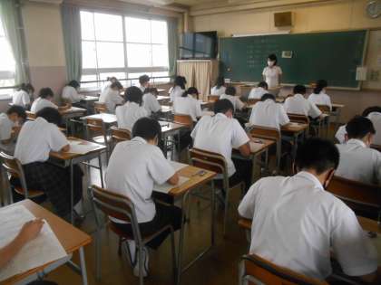 1年生は中学に入って初めての定期テストを受けています。社会の時間でした。