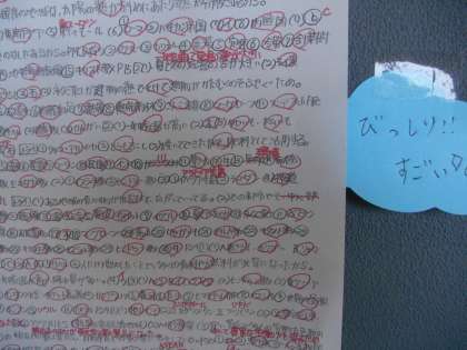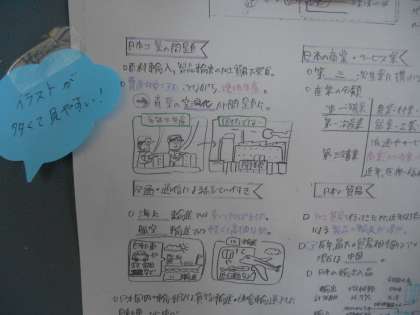 2年生のノートです。お手本となるものを廊下に掲示してありました。付箋に素晴らしい点が書かれています。読めますか。すばらしい。