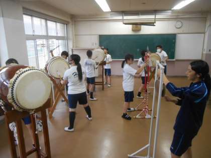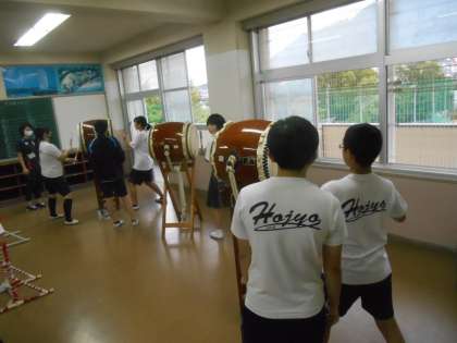 人権クラブの人たちが体育大会のオープニングでたたく太鼓の練習をしていました。3枚目は3年生が1、2年生に教えているところです。
