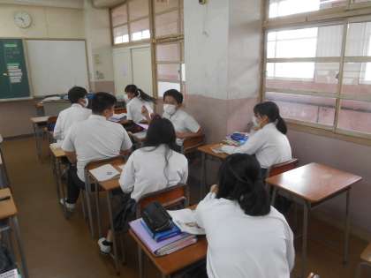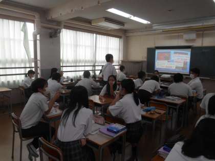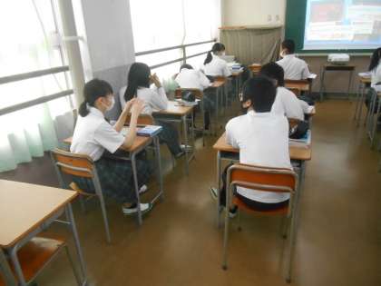 3年の英語の授業です。英語の授業でありながら国際的な問題であるフェアトレード(公正・公平な貿易)について理解を深めていました。