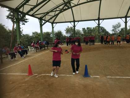 次のアクティビティは、バドミントンのラケットにラグビーボールをはさんでリレーをしました。