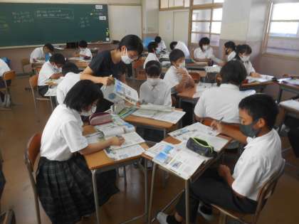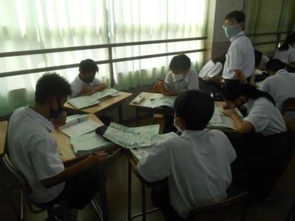 1年生の社会です。東南アジア、南アジアのことを知りつくして、何を聞かれても答えられるように調べ学習をしているところです。「プロ班をめざす。」という言葉が先生から聞かれました。