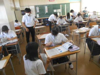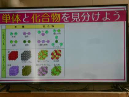 単体と化合物を見分けようというテーマの授業です。問題を解けた人からスモール先生になって分からない人に教えていました。