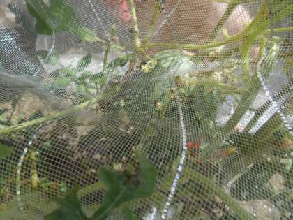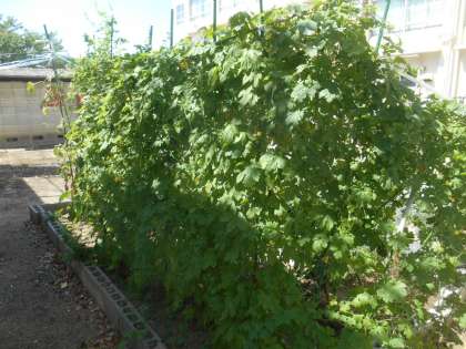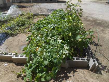 「校長先生ー。カラスにスイカを食べられました。」と悲しそうに言ってくる人がいました。見に行くと、1枚目のスイカ以外、すべて食べられてしまったそうです。やっぱり、それだけおいしかったんでしょうね。2枚目はサツマイモ、3枚目はゴーヤです。しばらく見ないうちに、ボリュームアップしました。