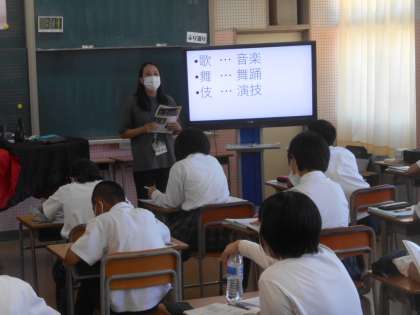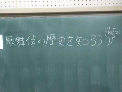 2年生の音楽です。「歌」は音楽を、「舞」は舞踊を、「伎」は演技を意味しているそうです。3枚目は先生が「読んでくれる人ー。」と言ったら、すぐに「はーい。」と元気な声で読んでいる人です。すばらしい。ありがとう。