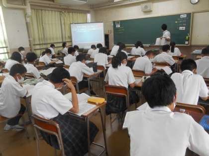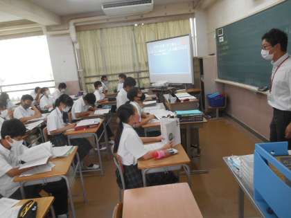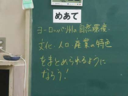 1年の社会です。ヨーロッパの産業、環境などについて学習していました。見学したときは、先生の説明が続いていました。