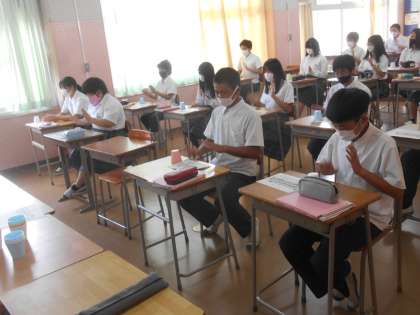 3年生の音楽です。プラスチックのカップを使って、リズムの勉強です。先生が示したリズムを基本に、アレンジを加えていくという授業です。