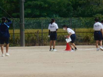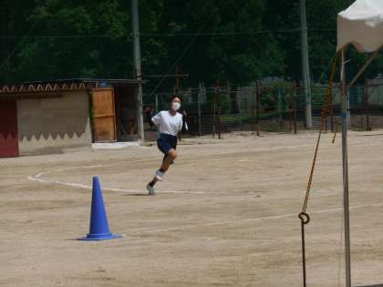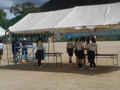 2年女子体育です。グラウンドをのぞいたとき、いきなり全力疾走の生徒を見て、胸が熱くなりました。すこしましとはいえ、まだ暑いです。テント下の陰も利用しています。