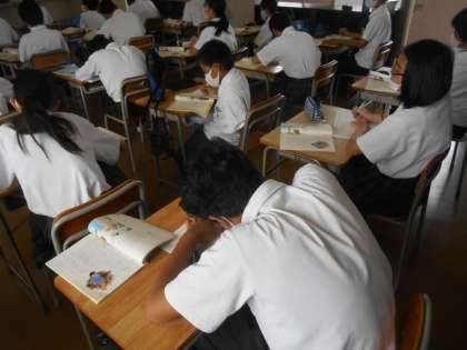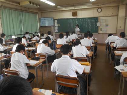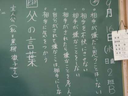 1年生の道徳です。車いすに乗った少女を見て、「自分」は隠れてしまいます。そのとき、その少女はどう思ったでしょう、と問いかけているところでした。道徳の答えは一つではありません。いろいろな意見が黒板に書かれていました。