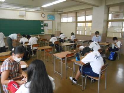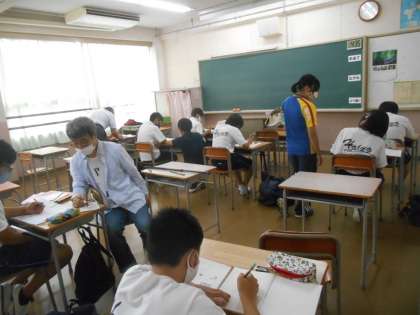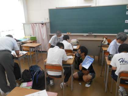 放課後の学び舎です。10人の生徒が参加しました。自分で勉強材料を持ってきています。元教諭の方や地域のボランティアの方に教わりました。生徒もよくがんばりました。教えてくれた先生たちにも感謝です。