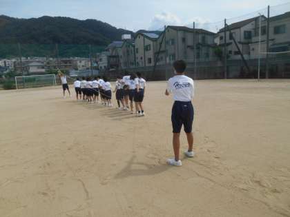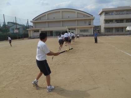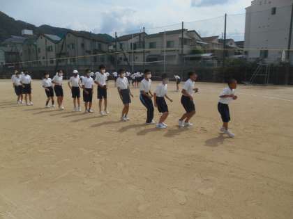 1クラスを2グループに分けて跳びます。1年生は慣れていないので、難しそうです。がんばれ。