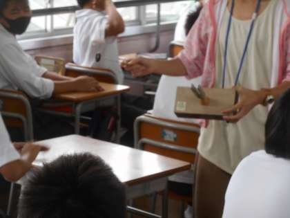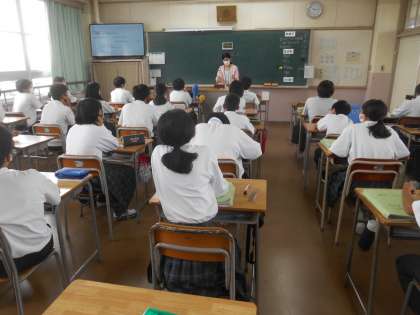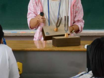 1年生の理科です。大きな音叉を教室に持ち込んで、振動によって音が伝わることを体感しました。3枚目は、一方の音叉を慣らすともう一方の音叉に振動が伝わり、小さな音が鳴ることを確認しています。教室中がシーンとして聞き入りました。これぞ、理科という授業でした。