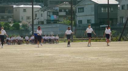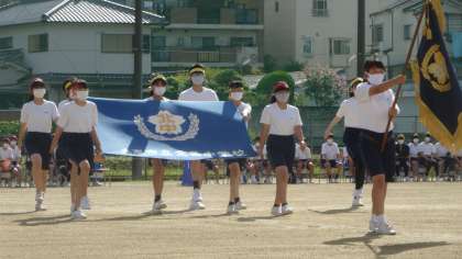 夜中の雨の影響もなく、今年度の体育大会を実施することができたことは本当にうれしいことです。予定の時刻どおりに開会式が始まりました。生徒会役員の人たちや体育委員を先頭に開会式の隊形に移動しているところです。