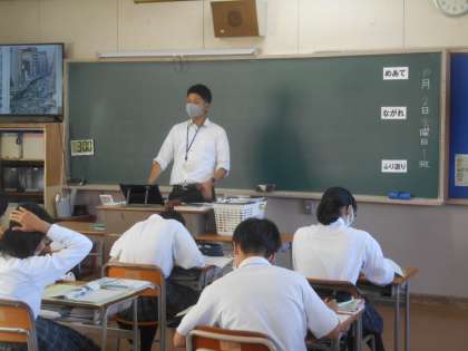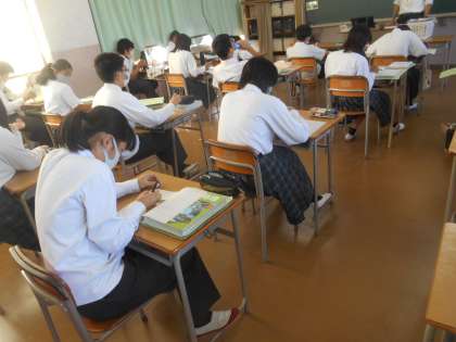 2年生の社会です。見学した時には、「みんな、知ってる?以前に犬を飼っている家に税金をかけようという話があったんですよ。」と先生が言うと、「じゃ、なぜ、猫はないんですか。」と生徒の質問。先生が「そうなんです。犬はいる、猫はいらん、鳥は?となって、線引きが難しくてやめになったんです。」とのこと。へー、知りませんでした。
