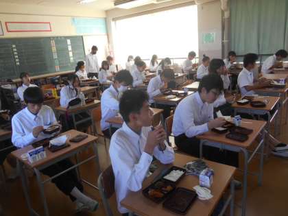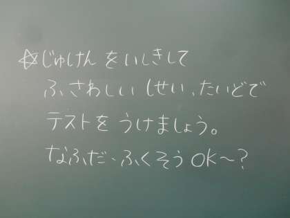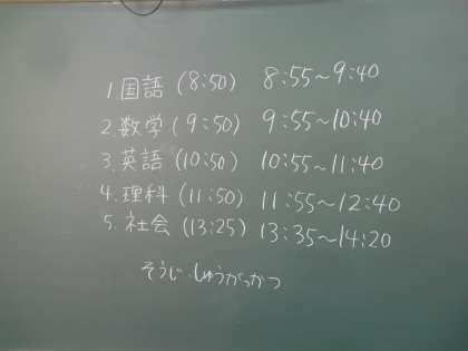 給食時間に教室をのぞきました。3年生の教室に行くと、校長を見て「よっしゃー。」と声をかけてくれる人がいて、とても気合が入ります。黒板は、今日、3年生が実力テストなので、「今日が入試と思って、〜」と心構えを書いたそうです。ひらがなで全部書いているのは、ひょっとして国語の漢字の出題に例えば「服装」とで出題されていれば困るので、ひらがなにしたそうです。なるほど。