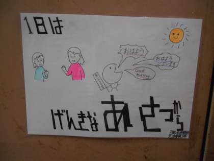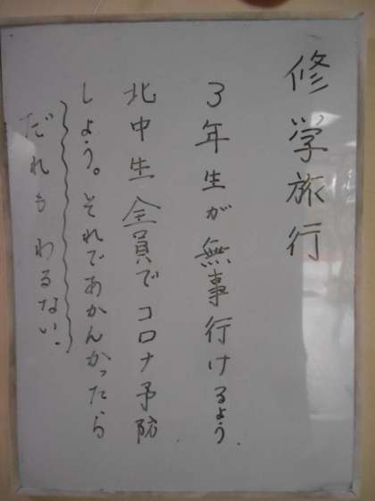 1枚目は生活委員会の人たちが、作ってくれたポスターです。この他にもたくさん書いてくれました。ありがとう。2枚目は校長からのメッセージです。1階階段付近に掲示しています。先日、体育大会でもPTA会長様がおっしゃってくださったことでもあります。がんばりたいです。