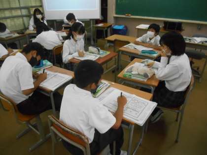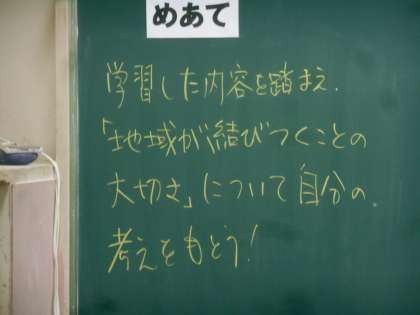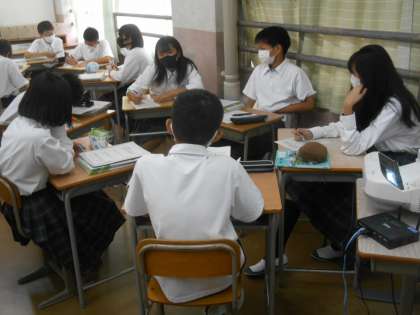 EUとはどんなものか、ビデオで学習し、資料も与えられて、自分たちでメリットデメリットを考えました。写真はグループで意見交流をしているところです。みんなで基本的資料に目を通し、また、ビデオを見て、自分の考えを作り、さらに、他者の意見を聞いたうえで、何がいいのか自分の結論を導き出す。いわば、みんなの話し合い(民主的手続き)を通して、正しいことは何か、考えるという今日の授業は、全世界に通じる、すばらしいものでした。このグループでの話し合いでも、自分にはない考えがあることを知り、始めの意見から変更した人もいました。