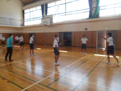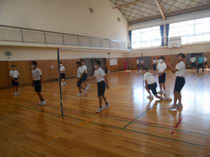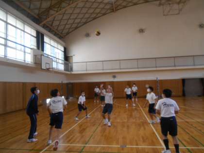 バレーボールです。ネットを挟んでゲーム形式の練習です。レシーブからトス、アタックとできていたので、驚きました。すばらしい。