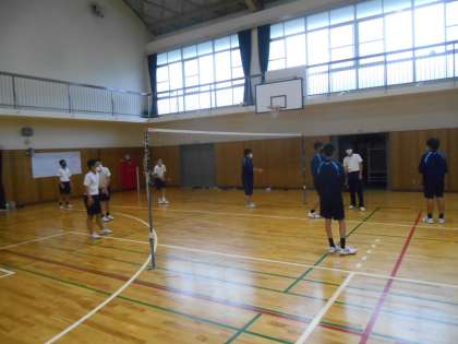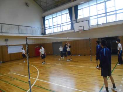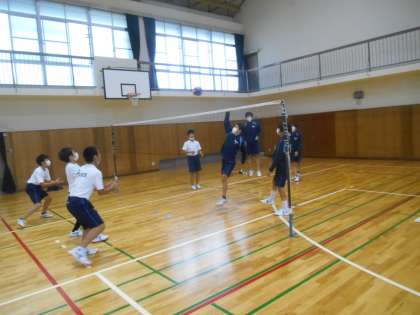 3年生の男子体育です。ネットをはさんでのゲーム練習です。