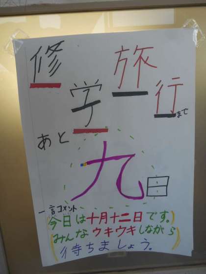 修学旅行まであと9日、いよいよという感じです。今日から文化祭の取り組み時間も始まります。