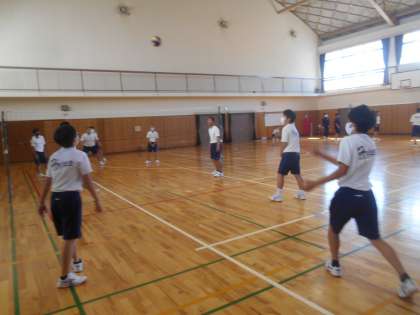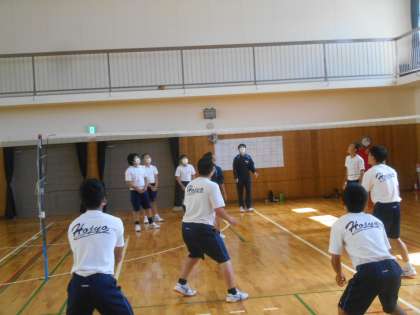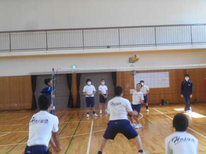 2年生男子の体育ですが、レシーブ、トス、アタックといわゆる三段攻撃が見られます。これは、たいへんすばらしいことです。なかなか、体育の授業でできません。すばらしい。