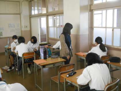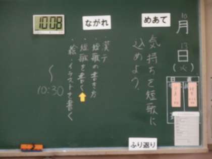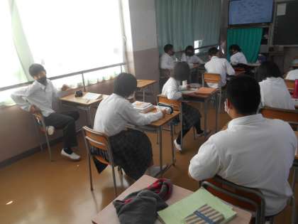 2年生の国語です。短歌を作ろうという授業です。自分の頭であれやこれや考えて、友人と「こんなんどう?」と言い合っているところです。すばらしい雰囲気の中、授業が進んでいました。