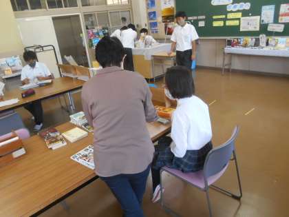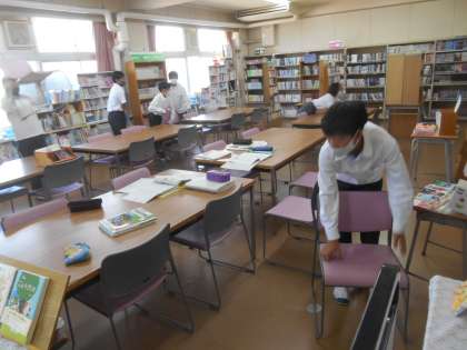 1枚目の写真。図書委員の人が作業しています。この人が入ってくるときに、「遅れてすみません。」と大きな声で担当の先生に言っていました。本当はぜんぜん遅れていませんが、それでも先生が先にいたので、そう言ったのだと思います。とても、気持ちがいい瞬間でした。ありがとう。2、3枚目も次の授業に向けて、イスを準備室から出して並べてくれている人たちです。ありがとう。